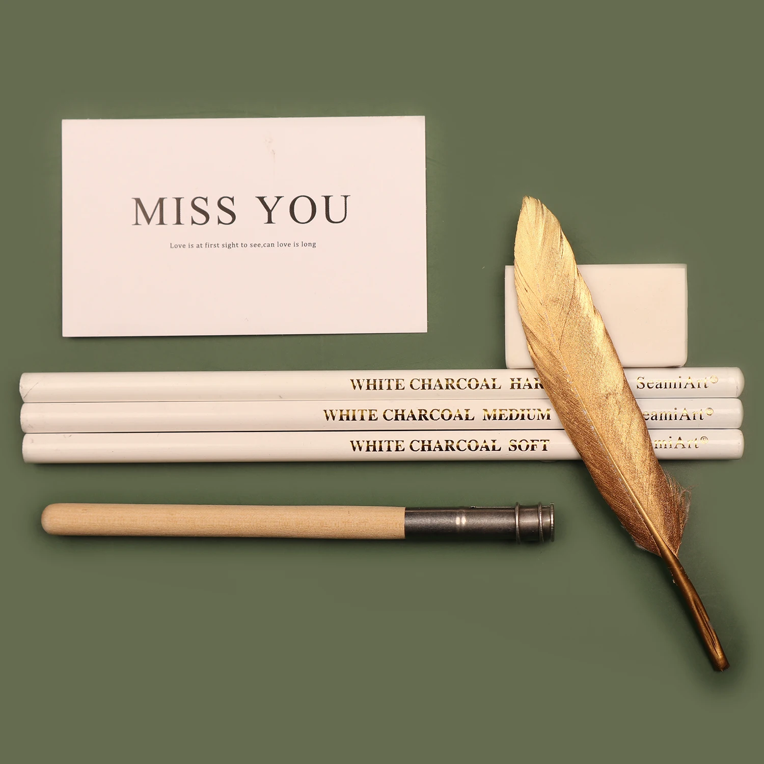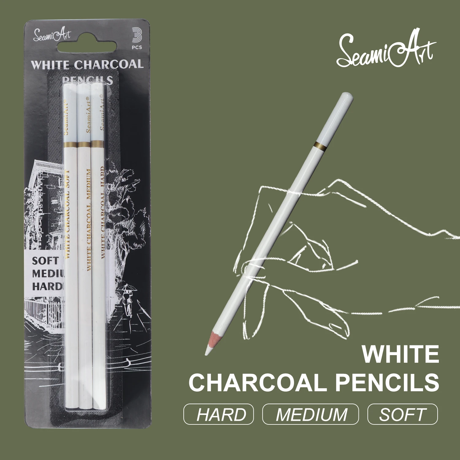 This set includes three white charcoal pencils in soft, medium, and hard grades. Each pencil offers a different level of opacity and smoothness for versatile drawing needs. The soft pencil creates rich, bright highlights. The medium pencil provides balanced coverage for general sketching. The hard pencil offers crisp, controlled lines for fine details. These pencils work beautifully on toned and dark papers. They are ideal for adding highlights and contrast to charcoal or graphite drawings. Artists can blend the pigment easily for smooth transitions. The durable cores resist breaking during